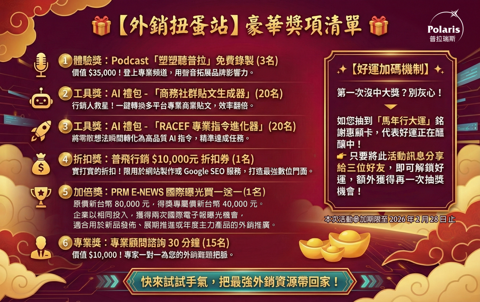如果你正思考新一年的外銷方向、品牌曝光或行銷工具配置,歡迎把握這段時間,為企業多準備一份實際可用的行銷助力。用一顆扭蛋,為外銷布局轉出一個真正派得上用場的小驚喜;在馬年,陪你把方向走穩、把市場走遠,讓每一步投入,都更有依據。