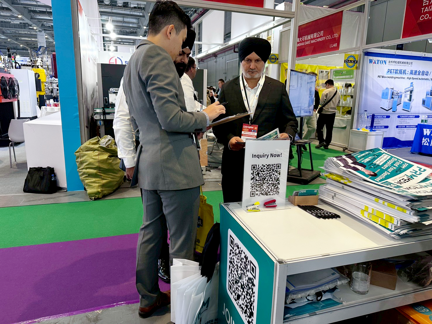雖然台灣的參展廠商數量不如以往,但有幾家是隔了多年又重回 CHINAPLAS,像是百久、三夏。同時,PRM 也聘請當地展務人員協助派發展報、填詢問函。這次比較特別的是:我們開始使用 PRM 剛完成的 AI 填問卷系統,只要把名片拍照,系統就能自動帶入買主資訊,大幅降低人工 key in 的錯誤率,也讓整體處理速度快很多。